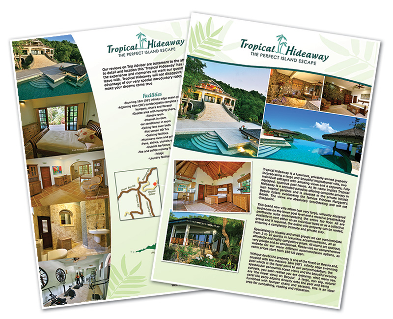 A 40+ page responsive website for a Caribbean boutique villa, consisting of pricing tables, availability calendars, galleries, custom graphics and panoramic slideshows. I also designed the villa logo and marketing flyers.