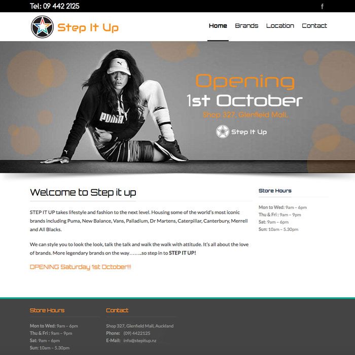 A new responsive website to support a new clothing retail store opening up in an Auckland Mall. Step it Up wanted an online presence so customers could get an idea of where they were located, store hours and what products they sold. I also created a facebook page to run alongside the website.