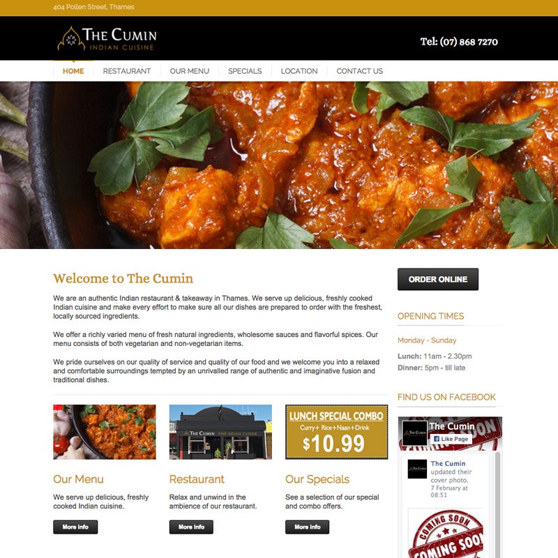 A new responsive and mobile friendly website for an Indian restaurant and Takeaway in Thames. Features included a facebook newsfeed on the website and downloadable food and drink menu’s. I also designed their logo, mailing flyer and stationery.